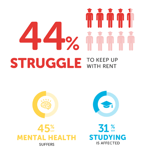 According to National Student Accomodation Survey 2018 on 2,246 students in the UK, 50% of the students rent from private landlords while only 20% get a place in university accommodation. The survey show that 44% of students find it hard to pay the monthly rent, 45% say the accommodation fees affect their mental health, while 31% cannot cope with their studies.